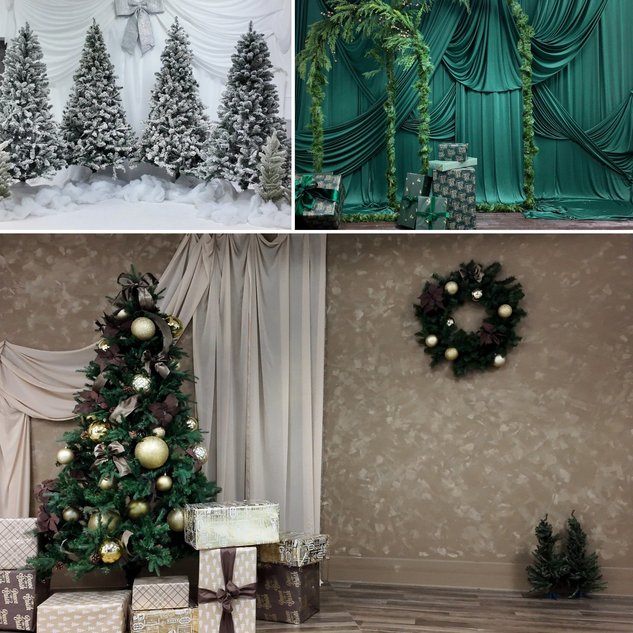 Celebrate the season in style by shooting on one or all 3 of our beautifully designed studio sets — a bright white winter wonderland, an elegant green holiday set up, and a cozy brown rustic corner. Perfect for families, couples, and portraits full of warmth and festive charm. Capture your Christmas story in different shades of the season!